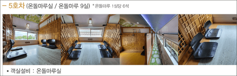 5호차는 가장 인기 있는 온돌마루실로 총 9개의 객실이 있습니다. 3인 ~ 6인이 독립된 공간에서 여행을 즐길 수 있기 때문에 인기가 가장 좋은 객실입니다.